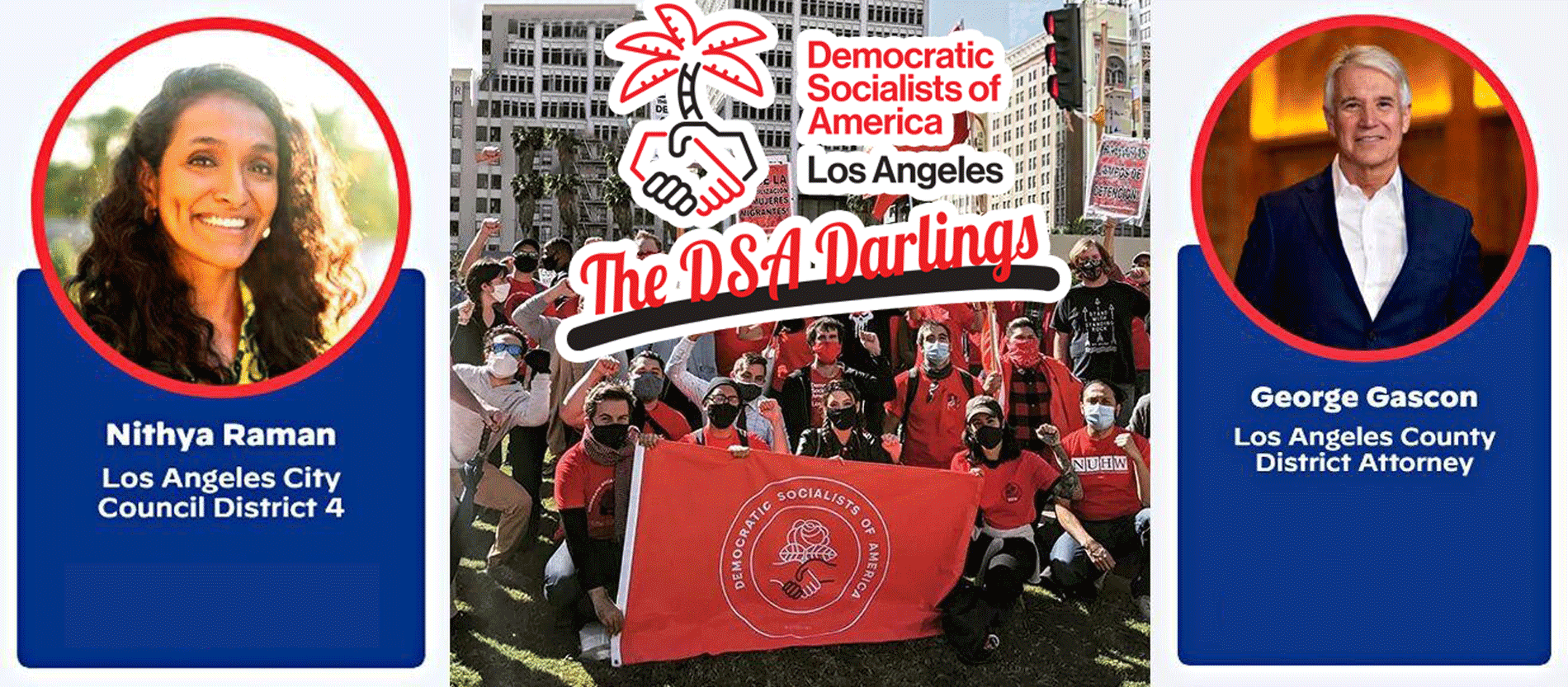 Nithya Raman is a dues paying member of the Democratic Socialists of America, DSA-LA and George Gascon is supported by the DSA-LA.